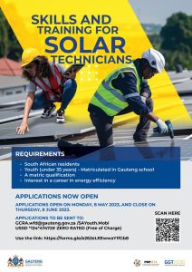 South African youth (under the age of 35 years) are eligible to apply and are encouraged to take advantage of this opportunity. Applicants must have matriculated in a Gauteng school after 2016. N3+ electrical qualification from a TVET college, and/or technical matric is an added advantage. Ideally, applicants must also have an interest in a career in energy efficiency, electrical work, and the green economy sector.