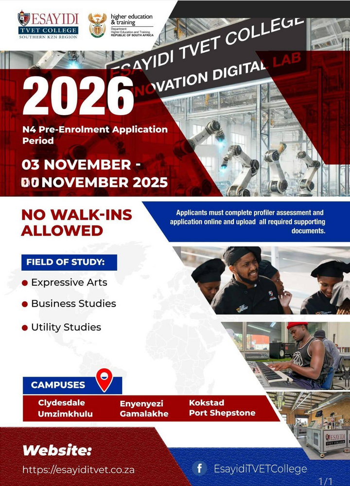 Esayidi TVET College Southern KZN Region offers a variety of courses from 6 Main Campuses, 5 Community Development Centres, the Sizanani Skills Centre based in Gamalakhe and our latest addition Esayidi Technology Centre located in Uvongo on the lower South Coast.