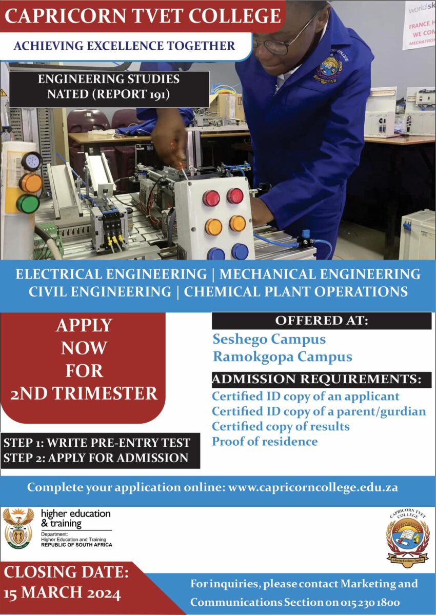 - Grade 9 Certificate with a 50% pass in Mathematics for ( Engineering NCV Courses)