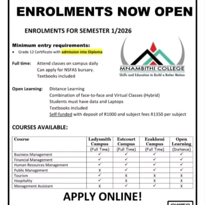 Applications: Applications to study at Mnambithi TVET College for 2026 are now open ‼️ ‼️