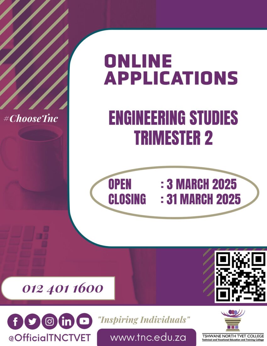 Tshwane North TVET College is excited to announce that Trimester 2 online applications for Engineering Studies are now open. Don’t miss your chance to secure your spot and take the first step toward a bright future in engineering!