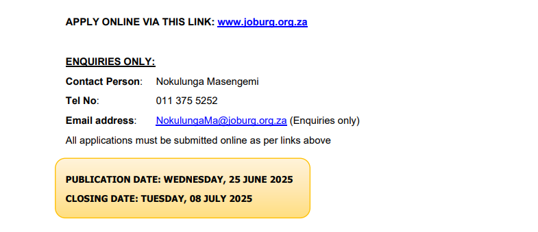 - Be domiciled within the jurisdiction of the Johannesburg Metropolitan area (Applicants must provide original proof of residence).