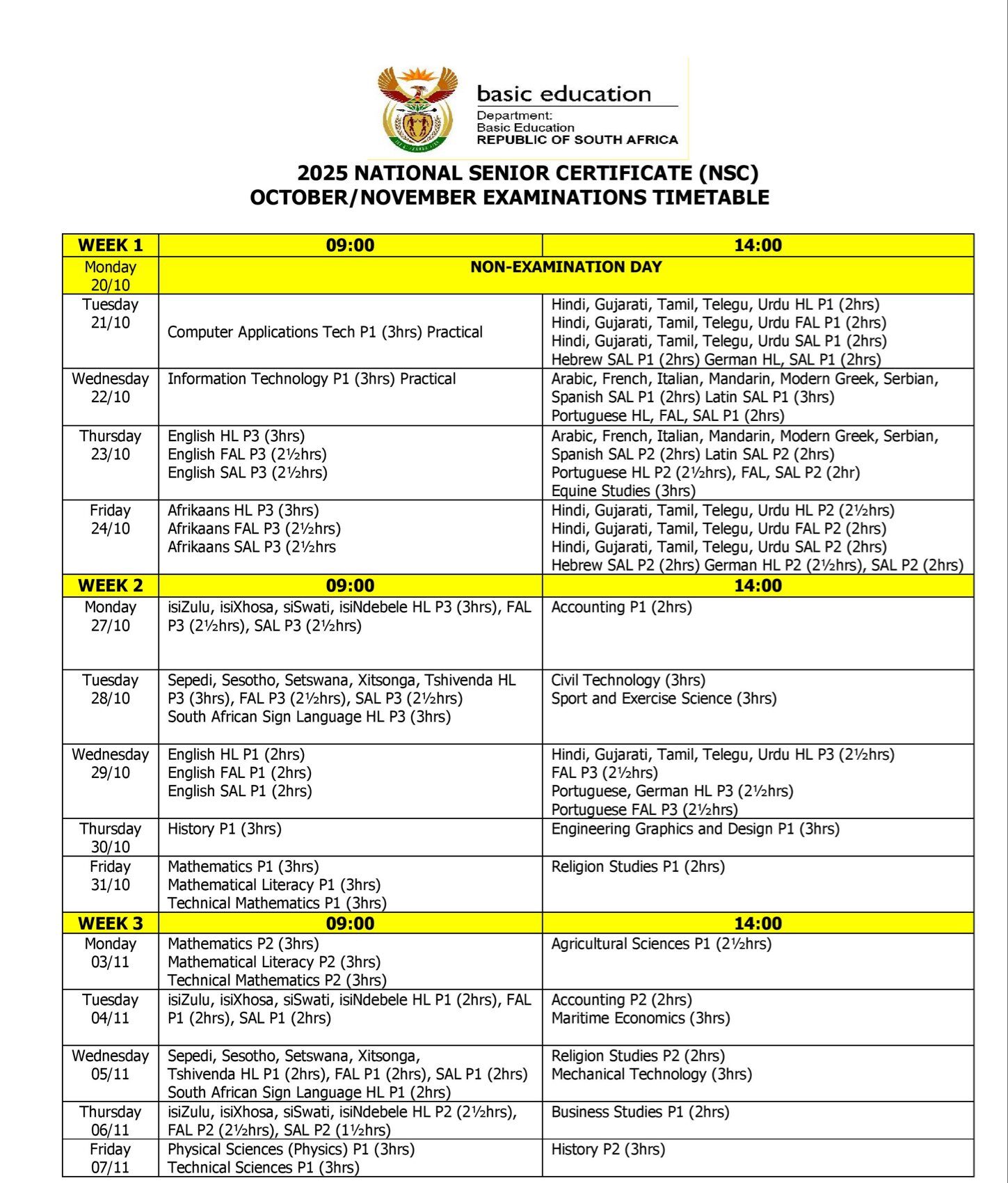 2025 National Senior Certificate (NSC) October/November Examination timetable